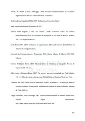 Powell, W. Walter y Paul J. Dimaggio. 1999. El nuevo institucionalismo en el análisis organizacional. México: Fondo de Cultura Económica. Real Academia Española (RAE), 2009. Definición de Concesión. http:// www.rae.es, consultado el 6 de marzo de 2013. Salazar, Clara Eugenia y José Luis Lezama. (2008). Construir ciudad. Un análisis multidimensional para los corredores de transporte de la Ciudad de México. México, D.F.: El Colegio de México. Scott, Richard W.. 2008. Institutions an organizations. Ideas and interests. United States of America: SAGE publications. Secretaría de Comunicaciones y Transportes. 2005. Quinto informe de labores 2004-2005. México. Serrano Rodríguez, Javier. 2010. Financiamiento de estructura de transporte. Revista de Ingeniería 32: 108-116. Silke, Adam y HanspeterKriesi. 2007. The network approach, compilado por Paul Sabatier, 129-154. Theories of the policy process .United States of America; Westview Press. Thomson, Ian. 2002. Impacto de las tendencias sociales, económicas y tecnológicas sobre el transporte público: investigación preliminar en ciudades de América Latina. Santiago de Chile: CEPAL. Vargas Hernández, José Guadalupe. 2002. Análisis de fundamentos de la teoría institucional. Revista Digital Universitaria. http://www.revista.unam.mx/vol.6/num8/art84/int84.htm 155