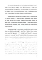Para comenzar con la explicación de lo que es una institución es pertinente recurrir a la obra de Powell y Dimaggio (1999, 33), quienes hablan sobre el trabajo de aquellos que se interesaron en formular nuevas definiciones dentro de la teoría del nuevo institucionalismo: “los estudiosos que han escrito sobre las instituciones a menudo las han definido de manera casual; el institucionalismo tiene distintos significados en distintas disciplinas”. Por un lado, la ciencia política a lo largo de los años se encargó de dar un significado a lo que es una institución en su conjunto. Sin embargo, de igual manera resultan ambiguos sus aportes. Para Peters (2003, 49) en esta disciplina se utiliza la palabra institución con amplia libertad y con una precisión limitada que deja dudas, ya que en ocasiones significa muchas cosas: desde una estructura formal, “como un Parlamento, hasta entidades amorfas, como la clase social”. Por su parte la sociología ha hecho lo propio al utilizar el término también de forma amplia pero con una diferencia, en la que se muestra como la institución funciona casi de la misma manera a una organización. “[…] en sociología funciona casi como un sinónimo de organización. Pero para que esta forma de análisis pueda contribuir al desarrollo de la disciplina tal como pretende, es necesario que adquiera mayor especificidad (Peters 2003, 49- 50). Ante la ambigüedad de la definición hay que recalcar que para efectos de esta investigación se retomara la idea que aborda a la institución como un conjunto de reglamentaciones, normas, supuestos y rutinas, donde se deja fuera la consideración de que es una estructura formal. En ese sentido, North (1993, 14) dice que la sociedad funciona obedeciendo diversas reglas cuyo resultado deriva en limitaciones e imposiciones ideadas por los mismos hombres. Lo que da sentido y forma a la interacción humana dentro del espacio social, son las instituciones cuya función principal es reducir la incertidumbre imponiendo 13