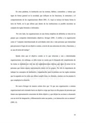 En otras palabras, la institución son las normas, hábitos, costumbres y rutinas que rigen de forma general en la sociedad, que influyen en las funciones, la estructura y el comportamiento de las organizaciones (Brett 2001, 5). Aquí se incluye de buena forma la tesis de North, en la que afirma que dentro de las instituciones es posible encontrar un conjunto de reglas formales e informales. Por otro lado, las organizaciones en una forma simplista de definirlas se trata de los grupos que comparten determinados objetivos. Krieger (2001, 3) define a la organización como el “conjunto interrelacionado de actividades entre dos o más personas que interactúan para procurar el logro de un objetivo común, a través de una estructura de roles y funciones, y en una división del trabajo”. Queda claro que el objetivo común es lo que relaciona y une a determinadas organizaciones, sin embargo, se debe tomar en cuenta que la búsqueda del cumplimiento de las metas es mediada por otro tipo de reglamentaciones internas que rigen el actuar de las personas que tienen alguna representación dentro de los grupos. Por ello la importancia de trabajar los conceptos de institución y organización, pues la primera son las reglas mientras que la segunda son los entes que deben cumplir éstas, no obstante, cuentan con las propias lo que complejiza la situación. De nuevo Krieger de manera certera dice que “el que una organización o sistema organizacional esté orientado hacia un objetivo exige que haya en ella grupos de personas que tienen una representación consciente de dicho objetivo y que dirijan las acciones a alcanzarlo con un nivel de integración y diferenciación entre sus partes, y en interacción con su entorno” (2001, 8). 16