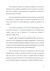 De tal forma que la eficacia de las organizaciones dependerá de la existencia de instituciones que sean aceptadas por la totalidad de los actores involucrados, lo que ayudará a dejar de lado o subordinar los intereses personales de la organización lo cual impactará en forma positiva dentro de la sociedad. En suma, hay que enfatizar en las diferencias entre una institución y una organización: Una institución es el conjunto de reglas que estructuran las interacciones entre todos los actores, donde se incluyen a las mismas organizaciones y entidades que participan en una actividad. Por otra parte una organización es el actor colectivo formal que podría ser sujeto de una restricción institucional. “La organización generalmente tiene una estructura interna (orgánica), sistema que rige las interacciones de las personas que constituyen la organización” (Knight 1992, 2). Siguiendo la idea de la ampliación de la especificidad de Peters, en la que hay que otorgar mayor nivel de especificidad en la mirada neo institucionalista, se debe decir que para el estudio del transporte de Hermosillo se trabajó bajo el supuesto en el que la institución se entiende como un todo conjunto de reglas que vigilan el funcionamiento de cada una de las organizaciones, las cuales cuentan con reglas y funcionamientos propios. Sobre esto Brett (2001, 6) previene que las organizaciones se rigen por las reglas institucionales, pero es posible que se presente una ruptura en ese sentido y la organización actué de tal manera en la que sólo se enfoque en la ganancia privada, ello implica el quebranto de las reglas de la institución. Por eso la importancia de tomar en cuenta, como se hace en este trabajo investigativo, las reglas formales e informales desarrolladas por North. 17
