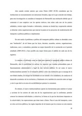 Aún cuando existen autores que como Peters (2003 49-50) consideran que las instituciones no necesariamente son estructuras formales, algo en lo que coincide este trabajo, para esta investigación se considera al transporte de Hermosillo una institución debido que al contrastar el caso empírico con los aportes teóricos, éste reúne cada uno de los puntos señalados, existen reglas formales e informales, sistemas en donde hay cooperación además se detectan varías organizaciones que marcan la pauta en los proyectos de modernización del transporte o políticas públicas a implementar. De este modo el problema o política del transporte público urbano es abordado como una “institución”; de tal forma que las leyes, decretos, acuerdos, actores, organizaciones, tradiciones, usos y costumbres, permiten un mejor desarrollo de lo acontecido en el periodo estudiado (2009-2012) y hace posible una mejor forma para el análisis de cada uno de los registros. Lo anterior, al utilizarse como un lente para analizar el transporte público urbano de Hermosillo, abre la posibilidad de enfocar los aspectos que resultan primordiales para el funcionamiento administrativo y legal de este servicio público. Es así como el nuevo institucionalismo permite ver al transporte público como una institución que se encarga de la movilidad citadina, de otorgar las facilidades en ese sentido a los ciudadanos, de coadyuvar al desarrollo económico de los territorios y finalmente sirve también de conexión entre un lugar y otro lo que deriva en actos de sociabilidad por quienes lo consumen. En síntesis, el nuevo institucionalismo aporta las herramientas para analizar el actuar y accionar de los actores de cada una de las organizaciones que la conforman, permite conocer los intereses individuales y colectivos, la forma en la que las decisiones impactan en la colectividad y las repercusiones que éstas traen a futuro. Para el caso del transporte, como en otros servicios públicos, las reglas importan de tal manera que los avances en esta materia 18