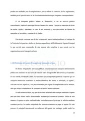 pueden ser mediados por el cumplimiento o, en su defecto lo contrario, de los reglamentos, también por el ejercicio nulo de las facultades sancionadoras por las partes correspondientes. El de transporte público urbano en Hermosillo, al ser un servicio público concesionado, implica la participación de al menos dos partes. Una que se encargue de dictar las reglas, vigilar y sancionar, en caso de ser necesario, y otra que realice las labores de operación en las calles y avenidas de la ciudad. Esto da pie a retomar una de las variantes del nuevo institucionalismo, el enfoque de la Teoría de la Agencia o, dicho en términos específicos, del Problema del Agente-Principal lo que servirá para comprender de una manera más completa lo que sucede con las organizaciones en el transporte urbano. 1.2.El Problema del Agente-Principal en el transporte urbano De forma obligada los servicios públicos concesionados en cualquier administración pública son sinónimo de una forma de relación entre el responsable del servicio y el operador. En ese sentido, Gorbaneff (2003, 76) menciona que es importante partir del “supuesto que en cualquier interacción económica se pueden identificar dos partes, el principal y el agente”, cada uno con sus objetivos y sus procedimientos para lograr el cumplimiento de los mismos, idea que refleja la importancia de la mirada del nuevo institucionalismo. En este orden de ideas, hay que decir que el principal debe delegar autoridad al agente para que éste último realice determinadas acciones por cuenta del primero. Dicho de otra manera, el agente es quien realizará todos los trabajos que el principal le solicita mediante contratos previos, los cuales estipularán los montos económicos a pagar al agente. En este proceso el principal desconocerá los esfuerzos del agente, sin embargo, podrá medir los 19