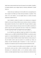 elaboró todo un sistema doctrinal sobre la base del concepto de servicio público, al prohibir a los tribunales judiciales conocer cualquier materia de contencioso administrativo” (Calafell 1988, 191). Existen teorías que consideran que el servicio público sólo es una pequeña parte de todo el conjunto de actividades que el Estado realiza para beneficiar a la población. “Estas teorías son las más modernas y las más aceptadas dentro de la doctrina del derecho administrativo (Calafell 1988, 191). Aquí se instalan los contratos de concesión; en esas empresas que se encargan de brindar los servicios que el Estado por falta de recursos económicos, humanos y tecnológicos, deja de atender de forma directa. Por ello Calafell (1998, 192) acepta la definición y agrega: “nosotros nos sumamos a ellas pues es claro que no todo el servicio público es prestado por el gobierno aunque éste ejerza un papel policía sobre ellos, el Estado tiene un infinidad de actividades que están relacionadas con la prestación de los servicios públicos.” En ese sentido, hay que señalar que otorgar una concesión de servicio público, cualquiera que éste sea, implica ceder parte del poder del Estado a los particulares quienes seguirán con el manejo individualista de lo que para ellos es su negocio, ligado en cierto punto al interés de lograr un beneficio social pero siempre viendo por sus bienes privados. El tema del beneficio colectivo puede estar presente en las actividades que realicen, sin embargo, éste pierde determinado grado de importancia si se toma en cuenta que lo importante es la recaudación por parte de las empresas privadas más allá del bien común. Es así como el concepto de servicio público, para esta investigación se define: “como toda prestación concreta que tienda a satisfacer necesidades públicas y que es realizada directamente por la administración pública o por los particulares mediante concesión, arriendo o una simple reglamentación legal, en la que se determinen las condiciones técnicas 24