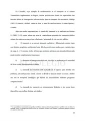 En Colombia, cuyo ejemplo de modernización en el transporte es el sistema Transmilenio implementado en Bogotá, existen publicaciones donde los especialistas han buscado definir de forma precisa cada uno de los tipos de transporte. En ese sentido, Hidalgo (2005, 95) detectó y definió varios de ellos: a) buses de carril exclusivo, b) trenes ligeros y, c) metro. Algo que resulta importante para el estudio del transporte es lo realizado por Ortúzar S. (2000, 12-13), quien indica una serie de características generales del transporte público urbano, las cuales en su mayoría se relacionan a la demanda de este servicio público. a) El transporte es un servicio altamente cualitativo y diferenciado: existen viajes con distintos propósitos, a diferentes horas del día, por diversos medios, para variados tipos de carga. […] Un sistema sin los atributos que permitan satisfacer esta demanda diferenciada puede resultar completamente inadecuado; b) La demanda del transporte es derivada: los viajes se producen por la necesidad de llevar a cabo determinadas actividades; c) La demanda de transporte está localizada en el espacio: para abordar este problema, este enfoque más común consiste en dividir el área de estudio en zonas y definir una red de transporte estratégica que facilite su procesamiento mediante programas 3 computacionales ; d) La demanda de transporte es eminentemente dinámica y hay pocas horas disponibles para realizar distintas actividades; 3 “La espacialidad de la demanda suele producir problemas de descoordinación que afectan el equilibrio entre la oferta y la demanda” (ibíd.). Un ejemplo son los taxis vacios que circulan en el centro de las ciudades y potenciales pasajeros (clientes) a la espera en otras áreas. 29