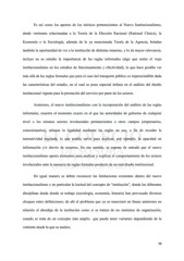 Es así como los aportes de los teóricos pertenecientes al Nuevo Institucionalismo, desde vertientes relacionadas a la Teoría de la Elección Racional (Rational Choice), la Economía o la Sociología, además de la ya mencionada Teoría de la Agencia, brindan también la oportunidad de ver a la institución de distintas maneras, y lo de mayor relevancia, incluye en su estudio la importancia de las reglas informales (algo que omite el viejo institucionalismo en los estudios de funcionamiento y efectividad), lo que hace posible ver más allá de las reglas formales que para el caso del transporte público es imprescindible dada las características del estudio, en el cual se pone especial énfasis en el análisis del diseño institucional vigente para la prestación del servicio por parte de los actores. Asimismo, el nuevo institucionalismo con la incorporación del análisis de las reglas informales, muestra el momento exacto en el que las autoridades de gobierno de cualquier nivel o los mismos actores involucrados pertenecientes a otros campos (empresarios, concesionarios), rebasan la legalidad mediante las reglas en uso, a fin de exceder la normatividad regulada, lo que podría servir para explicar, por ejemplo, la opacidad en información y/o desvío de recursos. En ese sentido, se supone de entrada que el nuevo institucionalismo aporta elementos para analizar y explicar el comportamiento de los actores involucrados ante la ausencia de reglas formales producto de un mal diseño institucional. De igual manera se deben reconocer las limitaciones existentes dentro del nuevo institucionalismo y en particular la laxitud del concepto de “institución”, donde las diferentes disciplinas desde donde se trabaja (sociología, economía, historia) han provocado diversos choques entre definiciones; de ahí el problema que ya se mencionó en líneas anteriores en relación al abordaje de la institución como si se tratara de un sinónimo de organización, cuando se trata de un concepto más amplio que puede tener variantes dependiendo de la vertiente desde la que se analice. 38