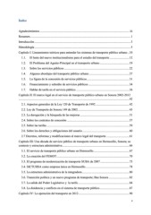 Índice Agradecimientos ...................................................................................................................... iii Resumen ..................................................................................................................................... 1 Introducción ............................................................................................................................... 3 Metodología ............................................................................................................................... 5 Capítulo I: Lineamientos teóricos para entender los sistemas de transporte público urbano .. 10 1.1. El lente del nuevo institucionalismo para el estudio del transporte .......................... 12 1.2. El Problema del Agente-Principal en el transporte urbano ....................................... 19 1.3. Sobre los servicios públicos ...................................................................................... 22 1.4. Algunos abordajes del transporte público urbano ..................................................... 27 1.5. La figura de la concesión de servicios públicos ........................................................ 31 1.6. Financiamiento y subsidio de servicios públicos ...................................................... 34 1.7. Hablar de tarifa en el servicio público ...................................................................... 36 Capítulo II: El marco legal en el servicio de transporte público urbano en Sonora 2002-2012 .................................................................................................................................................. 42 2.1. Aspectos generales de la Ley 120 de Transporte de 1992 ............................................ 42 2.2. Ley de Transporte de Sonora 149 de 2002 .................................................................... 43 2.3. La derogación y la búsqueda de las mejoras ................................................................. 51 2.4. Sobre los contratos de concesión .................................................................................. 57 2.5. Sobre las tarifas ............................................................................................................. 59 2.6. Sobre los derechos y obligaciones del usuario .............................................................. 60 2.7 Decretos, reformas y modificaciones al marco legal del transporte .............................. 61 Capítulo III: Una década de servicio público de transporte urbano en Hermosillo, Sonora; su contexto y estructura administrativa ........................................................................................ 66 3.1. El servicio de transporte público urbano en Hermosillo ............................................... 67 3.2. La creación del FEMOT ................................................................................................ 70 3.3. El programa de modernización de transporte SUBA de 2007 ...................................... 75 3.4. SICTUHSA como empresa única en Hermosillo .......................................................... 78 3.5. La estructura administrativa de la integradora .............................................................. 80 3.6. Transición política y un nuevo programa de transporte; Bus Sonora ........................... 82 3.7. La salida del Poder Legislativo y la tarifa .................................................................... 84 3.8. La disidencia y conflicto en el sistema de transporte público ....................................... 87 Capítulo IV: La operación del transporte en 2012 ................................................................... 90 v