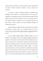 concesión que ampare al solicitante y los asuntos relacionados al cambio o modificación de rutas, horarios, el cambio o sustitución de unidades y la cesión o gravamen de las concesiones. A la estructura se agregan los Delegados Regionales del Transporte, quienes representarán al Poder Ejecutivo en los determinados territorios. Éstos velarán por el cumplimiento de los reglamentos; asimismo tienen la facultad de expedir permisos, ejecutar programas, intervenir en conflictos, vigilar que el servicio se cumpla, aplicar sanciones y hacer cumplir las decisiones y resoluciones de la Ley. Para cumplir la mayor parte de lo anterior descrito, se asigna la facultad a las Comisiones Municipales Reguladoras del Transporte Colectivo Urbano. Sobre los Inspectores de Transporte del Estado, la ley señala que entre sus facultades más importantes se encuentran: vigilar que se cumplan los horarios de servicio, os itinerarios, sitios, rutas, tarifas; también las medidas de seguridad, comodidad de terminales y vehículos. En cuanto al ámbito municipal, también se encuentran estipuladas una serie de facultades. Los ayuntamientos, a través de las Comisiones Municipales Reguladoras del Transporte Colectivo Urbano, en caso de que existan, tienen la autoridad para aceptar o rechazar los estudios técnicos y socioeconómicos realizados por el Estado para determinar cuáles son las necesidades del transporte. Estos estudios se realizan previa solicitud de los (mismos) municipios. También pueden establecer, modificar, ampliar o en su defecto, cancelar determinadas rutas. Aquí es pertinente señalar las responsabilidades que asumiría el municipio en caso de realizar las acciones antes descritas. El servicio de transporte público urbano, según lo estipula la legislación y toda la institución en su conjunto, se maneja a nivel Estado. Y a pesar de que es posible municipalizar este servicio público el esquema de trabajo 48