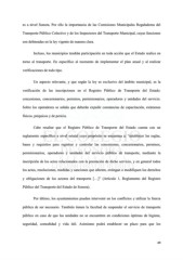 es a nivel Sonora. Por ello la importancia de las Comisiones Municipales Reguladoras del Transporte Público Colectivo y de los Inspectores del Transporte Municipal, cuyas funciones son delineadas en la ley vigente de manera clara. Incluso, los municipios tendrán participación en toda acción que el Estado realice en torno al transporte. En específico al momento de implementar el plan anual y al realizar verificaciones de todo tipo. Un aspecto relevante, y que según la ley es exclusivo del ámbito municipal, es la verificación de las inscripciones en el Registro Público de Transporte del Estado: concesiones, concesionarios, permisos, permisionarios, operadores y unidades del servicio. Sobre los operadores se señala que deberán expedir constancias de capacitación, exámenes físicos, psíquicos y de pericia. Cabe resaltar que el Registro Público de Transporte del Estado cuenta con un reglamento específico a nivel estatal cuyo propósito se encamina a: “establecer las reglas, bases y requisitos para registrar y controlar las concesiones, concesionarios, permisos, permisionarios, operadores y unidades del servicio público de transporte, mediante la inscripción de los actos relacionados con la prestación de dicho servicio, y en general todos los actos, resoluciones, medidas y sanciones que afecten, extingan o modifiquen los derechos y obligaciones de los actores del transporte […]” (Artículo 1, Reglamento del Registro Público del Transporte del Estado de Sonora). Por último, los ayuntamientos pueden intervenir en los conflictos y utilizar la fuerza pública de ser necesario. También tienen la facultad de suspender el servicio de transporte público en caso de que las unidades no se encuentren en condiciones óptimas de higiene, seguridad, comodidad y vida útil. Asimismo podrá establecer un plazo para que los 49