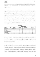 El COLEGIO DE SONORA Transferencia del Distrito de Riego 037,Altar-Pitiquito-Caborcai ransjerencia aei uistruo ae Juego V3 /, /uiar-ruiquuo-^aoorca Propiedad) y 31 pertenecientes al sexo masculino, representando 3 y 97% respectivamente. El grado de escolaridad de los Usuarios iba desde aquellos que no tenían ningún grado de escolaridad hasta los que contaban con el nivel de licenciatura; la moda se ubicó en el grado de licenciatura. El 79% del sector de la Pequeña Propiedad se ubicó en el grado de licenciatura, 14% en nivel primaria y 7% en secundaria; mientras que el 50% del sector Colono tuvo ningún grado de escolaridad, 33% en nivel primaria y 17% en secundaria. De los Usuarios del sector ejidal, 58% tiene primaria, 25% técnico/preparatoria y 17% alcanzó el nivel de licenciatura. CUADRO 26 Tipo de Usuario Grado de Pequeño Colono Ejidatario TOTAL Escolaridad propietario Ninguno - 3 3 Primaria 2 2 7 11 Secundaria 1 1 - 2 Técnico/preparatoria - - 3 3 Licenciatura 11 - 2 13 TOTAL 14 6 12 32 El tiempo que tienen practicando la actividad agrícola los Usuarios encuestados va desde 5 hasta 53 años, el promedio es de 26 años, la moda fue de 30 años, con 5 Usuarios que así respondieron. Un 86% de los Usuarios se encuentran sembrando vid, en superficies que van desde las 5 hasta las 770 hectáreas. Un 25% se encuentra sembrando espárrago en superficies que van desde las 45 hasta las 270 hectáreas; un 38% está sembrando olivo; una persona, esto es, un 3% tiene 6 hectáreas de cítricos; un 6% cultiva trigo, uno no quiso dar a