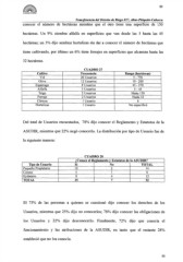 El COLEGIODESONORA Transferencia del Distrito de Riego 037, Altar-Pitiquito-Caborca conocer el número de hectáreas mientras que el otro tiene una superficie de 150 hectáreas. Un 9% siembra alfalfa en superficies que van desde las 5 hasta las 45 hectáreas; un 3% dijo sembrar hortalizas sin dar a conocer el número de hectáreas que tiene cultivando, por último un 6% tiene forrajes en superficies que alcanzan hasta las 32 hectáreas. CUADRO 27 Cultivo Frecuencia Rango (hectáreas) Vid 26 Usuarios 5-770 Olivo 12 Usuarios 10-200 Espárrago 8 Usuarios 45 - 270 Alfalfa 3 Usuarios 5-45 Trigo 2 Usuarios Hasta 150 Forraje 2 Usuarios Hasta 32 Cítricos 1 Usuario 6 Hortalizas 1 Usuario No especificó Del total de Usuarios encuestados, 78% dijo conocer el Reglamento y Estatutos de la ASUDIR, mientras que 22% negó conocerlo. La distribución por tipo de Usuario fue de la siguiente manera: CUADRO 28 ¿Conoce el Reglamento y Estatutos de la ASUDIR? Tipo de Usuario Sí No TOTAL Pequeño Propietario 12 2 14 Colono 5 1 6 Ejidatario 8 4 12 TOTAL 25 7 32 El 75% de las personas a quienes se cuestionó dijo conocer los derechos de los Usuarios, mientras que 25% dijo no conocerlos; 78% dijo conocer las obligaciones de los Usuarios y 22% dijo desconocerlo. Finalmente, 72% dijo que conocía el funcionamiento y las atribuciones de la ASUDIR, en tanto que el restante 28% estableció que no los conocía. 89