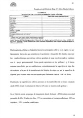 68 ELCOLEGIOPE SONORA Transferencia del Distrito de Riego 037, Altar-Pitiquito-Caborca CUADRO 13 SUPERFICIE DE CULTIVOS SEMBRADA EN EL AÑO 2000 Cultivo Superficie sembrada (hectáreas) Vid mesa 3,697 Vid pasa 6,000 Vid jugo 4,200 Espárrago 5,658 Olivo 1,500 Algodón 985 Trigo 6,500 Melón y Sandía 800 Hortalizas* 400 Frutajesdistintosa la vid y olivo" 1,500 Total 31,240 Chícharo chino, frijol ejotero, pickles, tomate industrial y alcachofa. " Naranja en un 90%, además, chabacano, nogal, durazno, almendro. Fuente: Resumen del Plan Emergente para el Desarrollo de la Región Agrícola del Desierto de Altar, ASUDIR 037, SOCOADA, Asociación Local de Productores de Frutas y Hortalizas, Septiembre de 2000 y Distrito de Desarrollo Rural No. 139 Caborca, SAGARPA. Históricamente, el trigo y el algodón fueron los principales cultivos en la región ya que básicamente fueron los que permitieron el nacimiento y desarrollo del distrito, pues éste fue creado al tiempo que dichos cultivos gozaban de auge en el mercado y contaban con el apoyo gubernamental. Como puede apreciarse en las gráficas 3 y 4 fueron extensas superficies que se establecieron, coincidentemente la superficie de trigo fue decreciendo a la par de la transferencia del distrito de riego, no así la superficie de algodón, pues en esos años tuvo un repunte para finalmente caer de 1996 a la fecha. Finalmente, la superficie de cultivos perennes se ha mantenido más o menos constante desde 1980, siendo el principal de ellos la vid2 como se muestra en la gráfica 5. En el Distrito existe un parque de maquinaria donde destacan 1,250 tractores con edad promedio de 15 a 20 años; de ellos, 57% se encuentran en buenas condiciones, 28% en regulares y 15% en malas condiciones. 68