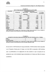 71 ELC01EC10 DESONORA Transferencia del Distrito de Riego 03 7, Altar-Pitiquito-Caborca CUADRO 15 RIEGO PRESURIZADO POR TIPO DE CULTIVO (2000) CULTIVO SUPERFICIE (Hectáreas) Establecidas Riego Rodado Riego presurizado % de riego presurizado ANUALES Trigo 6,500 6,350 150 2 Algodón 985 735 250 25 Varios 1,400 200 1,200 86 Subtotal 8,885 7,285 1,600 18 PERENNES Vid* 13,897 8,937 4,960 36 Espárrago 5,658 858 4,800 85 Olivo 4,000 1,800 2,200 55 Alfalfa 1,970 1,970 0 0 Cítricos 1,400 1,190 210 15 Varios 1,802 1,722 80 4 Subtotal 28,727 16,477 12,250 43 TOTAL 37,612 23,762 13,850 37 * Vid Mesa, Vino y Pasa. Fuente: Resumen del Plan Emergente para el Desarrollo de la Región Agrícola del Desierto de Altar, ASUDIR 037, SOCOADA, Asociación Local de Productores de Frutas y Hortalizas, Septiembre de 2000. CUADRO 16 SUPERFICIE DE RIEGO PRESURIZADO POR TIPO DE TENENCIA DE LA TIERRA Ejidal 23% Comunal 2% Pequeña Propiedad 75% Fuente: Resumen del Plan Emergente para el Desarrollo de la Región Agrícola del Desierto de Altar, ASUDIR 037, SOCOADA, Asociación Local de Productores de Frutas y Hortalizas, Septiembre de 2000. De las más de 13,000 hectáreas de riego presurizado, 10,000 hectáreas fueron apoyadas con el Programa Alianza para el Campo; en el año 2000 se apoyarían 1,000 hectáreas más. La problemática en la adquisición de estos sistemas es que la mayoría de los productores que no han instalado riegos presurizados no lo hacen por falta de recursos económicos. 71
