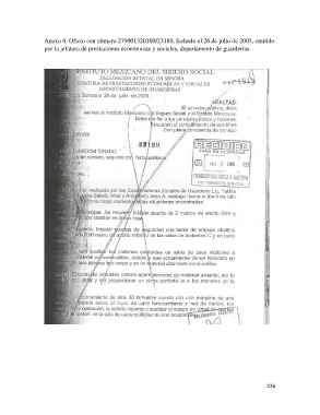 Anexo 6. Oficio con número 279001320100/23180, fechado el 26 de julio de 2005, emitido por la jefatura de prestaciones económicas y sociales, departamento de guarderías. 226