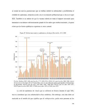 Figura 47. Defunciones anuales y epidemias en el antiguo Hermosillo, 1814-1900